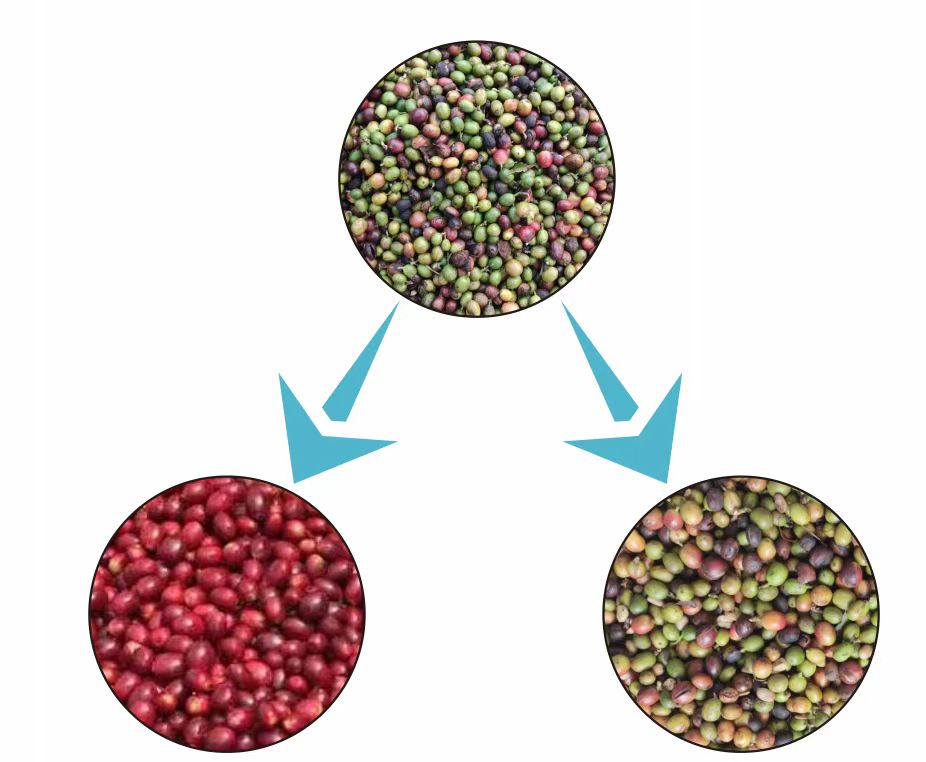 Macchine per la selezione del colore delle ciliegie di caffè Il sistema utilizza una combinazione di telecamere e algoritmi informatici per rilevare il colore delle ciliegie di caffè. Successivamente, dei getti d'aria separano le ciliegie che non presentano il colore desiderato. Questo processo viene ripetuto finché tutte le ciliegie non sono state separate in base al colore.